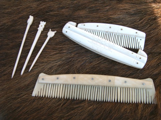 Above you will see an example of a comb commissioned from us for public use and display. This example has thickened comb teeth for extra strength when handling. We are always happy to tailor objects to an accuracy level suitable to you. Whether that be museum grade replica, or with concessions to accuracy for the sake of practicality and safety, especially if these objects are to be used with schools groups and public displays in mind. After all, we are using these objects for a different purpose to the originals, and the key thing is that they provide value and enjoyment. Below are examples of finished combs (and three pins), we use bleached bone which is a clean safe material. The pins and cased comb are bleached bone as it is, the lower example has been treated afterwards with vegetable oil to restore some of the original colour and patina, but the choice is entirely up to you.