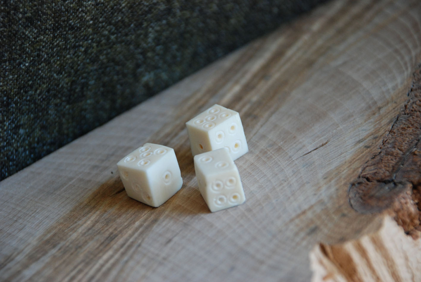 These Bone Dice are copied from some examples from South Shields Roman fort, though these dice have been found from all over the Roman world, and indeed many other periods too!