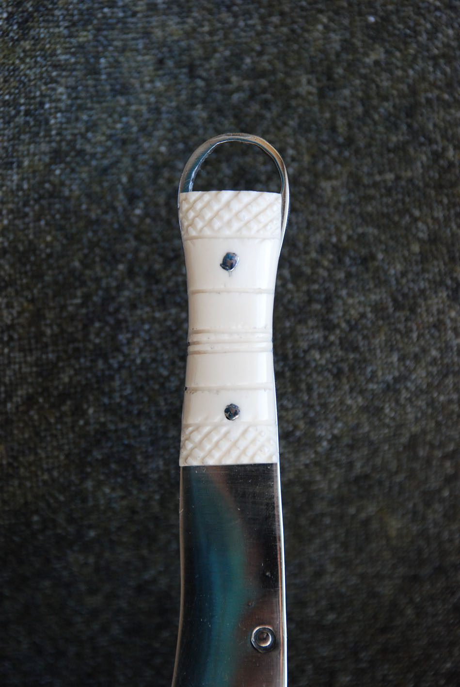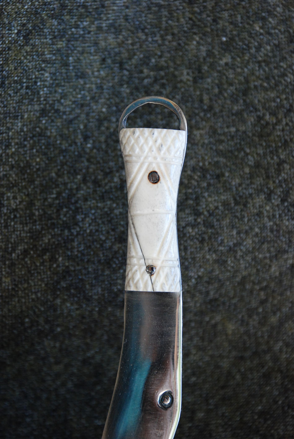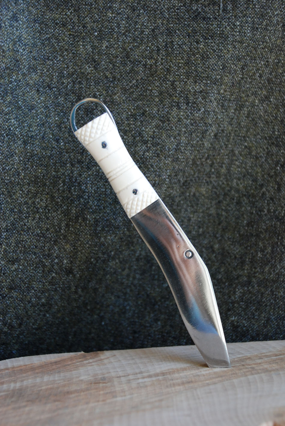 The Blades are forged to shape, then ground, the D loop cut and filed, and then tempered. The bone handles are hand cut and polished to any design of your choosing, and riveted into position. The blades can be supplied to your required level of sharpness (or blunts for public display) and a sheath can be produced on request at additional cost. Particular blade shapes can be requested, but it must be noted that the nature of the process means that small variations can and will occur.