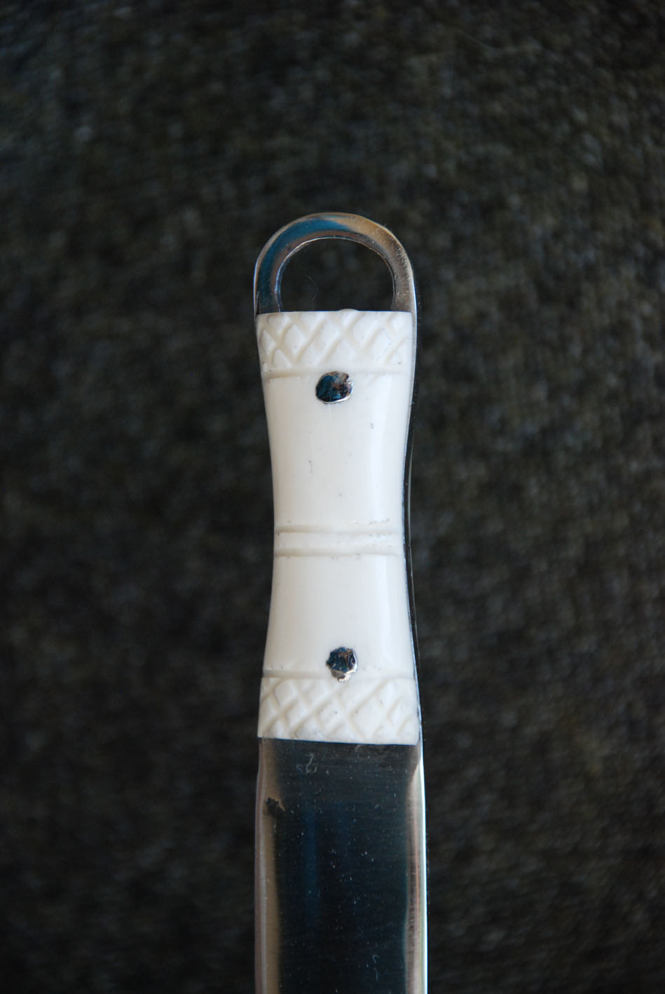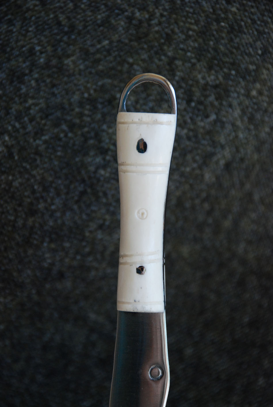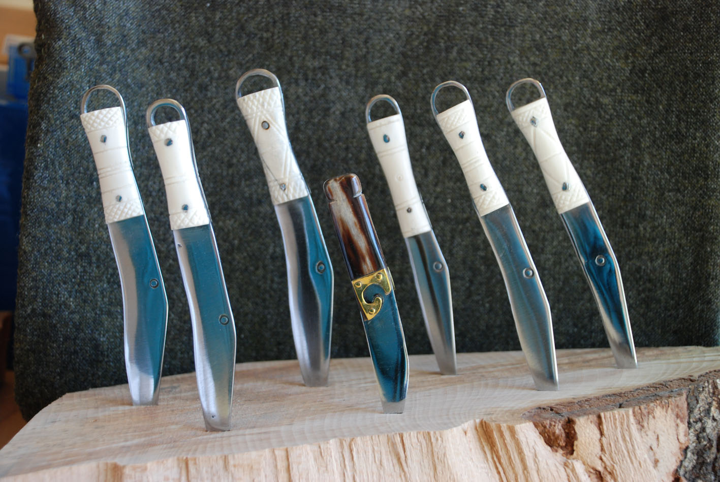 The Blades are forged to shape, then ground, the D loop cut and filed, and then tempered. The bone handles are hand cut and polished to any design of your choosing, and riveted into position. The blades can be supplied to your required level of sharpness (or blunts for public display) and a sheath can be produced on request at additional cost. Particular blade shapes can be requested, but it must be noted that the nature of the process means that small variations can and will occur.